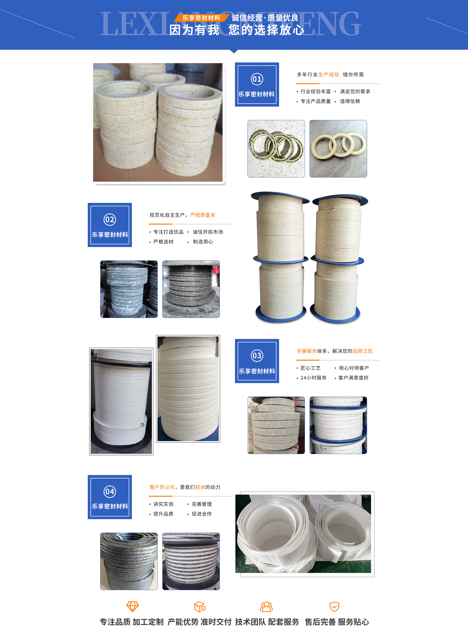 大城縣樂(lè)享密封材料有限公司主營(yíng):芳綸盤(pán)根,四氟盤(pán)根,碳素盤(pán)根,石棉盤(pán)根,芳綸墊片,石棉浸液盤(pán)根,芳綸盤(pán)根墊片,無(wú)油白四氟盤(pán)根,含油白四氟盤(pán)根,含油黑四氟盤(pán)根,石棉含油盤(pán)根,芳綸碳素盤(pán)根,石棉橡膠盤(pán)根,芳綸碳素混編盤(pán)根、聚四氟乙烯板(四氟板)等,是生產(chǎn)銷售密封件的廠家,廣泛應(yīng)用于石油、化工、造紙、造船、發(fā)電、冶金等工業(yè)設(shè)備的管道、閥門(mén)、法蘭、換熱器等。